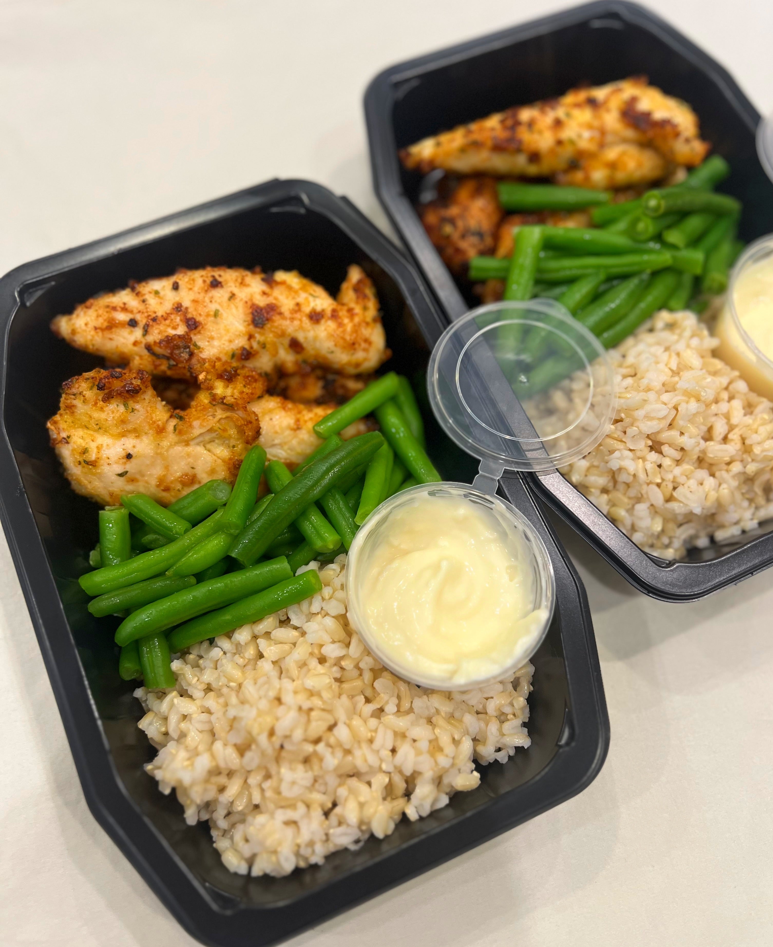 Chicken Tenderloins, Olive oil, Vinegar, Salt, Pepper, Rice Flour, Chicken Flavour, Food Acid (Citric), Sugar, Garlic, Onion, Lemon Peel, Canola oil, Lemon Flavour, Lemon Oil, Green Beans, Brown Rice, Egg, Garlic, White Vinegar, Dijon Mustard, Sugar, Lemon Juice, Spice